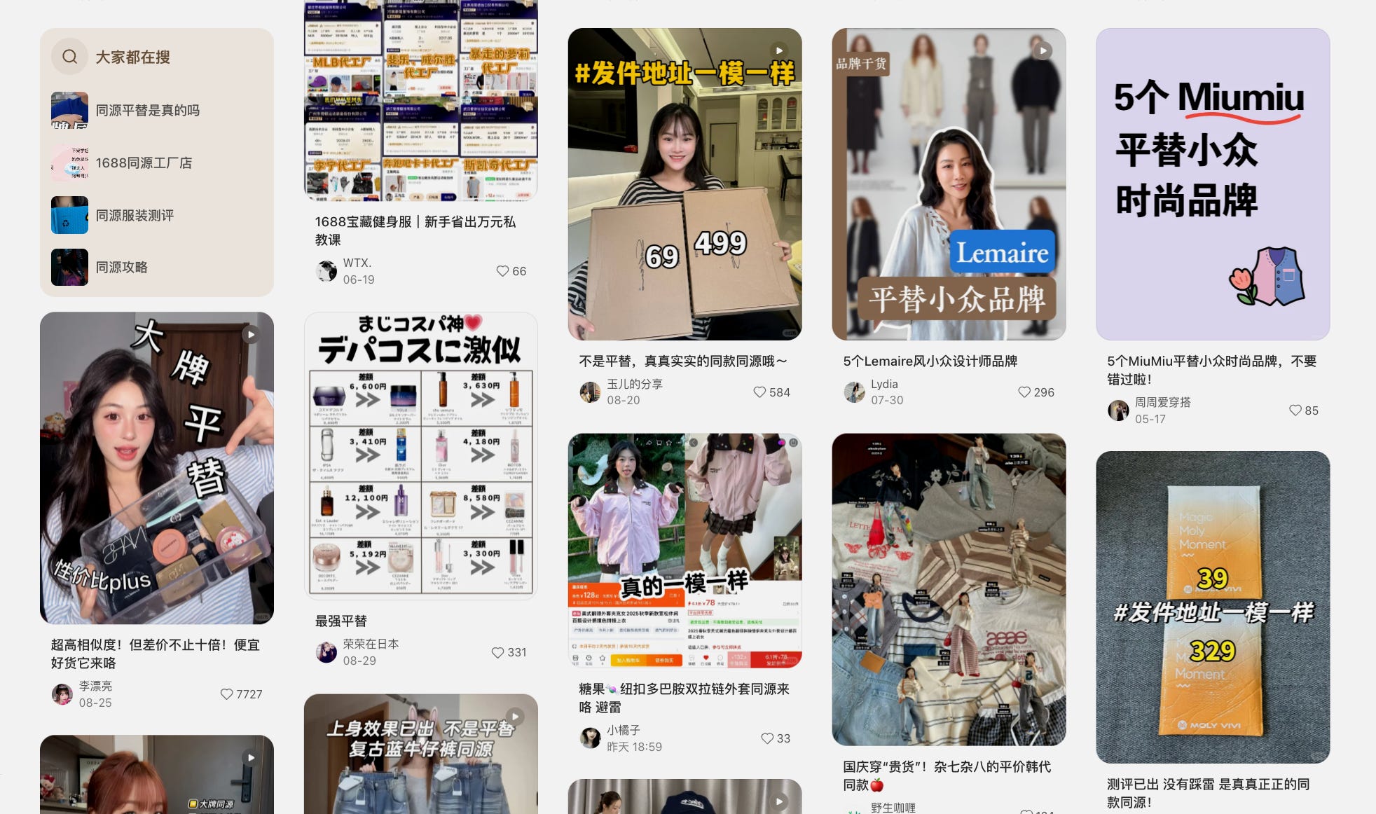 First, the hunt for 平替 (píng tì), as known as affordable, high-quality substitutes, often perceived as a ‘smart replacement’ for an expensive product. This led to new forces such as: 平替网红 (píng tì KOL – influencers such as @平替君 who build a following by finding and reviewing high-quality, affordable alternatives), 同源平替 (an affordable product that is made in the same factory or with the same materials as a premium brand), 海外好物平替 (alternatives to popular foreign products), and ofcourse, the latest evolution of all: 替中替 (tì zhōng tì), which literally translates to ‘the substitute for the substitute’, meaning the even more affordable alternative to the already-affordable píng tì.
