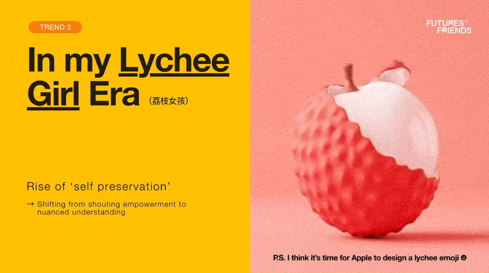 I noticed a powerful cultural archetype emerging from China: the core idea is the focus on ‘self-preservation’. Borrowing the term ‘Lychee Girl’ from this campaign by Chinese indie beauty brand DDG who launched a lychee line, the analogy is perfect: a hard, resilient outer shell protecting a sweet and vulnerable inner core.