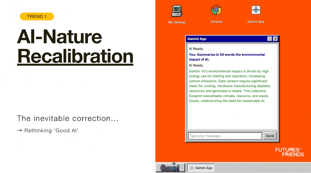 For a long time, the tech world seemed to have operated as if it were exempt from this rule. The AI boom and the resulting surge in energy and water consumption by new large-scale models has made this imbalance impossible to ignore. This is why the first and most critical trend is my prediction of an AI-Nature Recalibration — the inevitable correction to restore this balance. We’re starting to see its manifestations in calls for mandatory AI resource audits and new benchmarks that measure performance not just by speed, but by environmental impact. This trend is a call to redefine what 'good AI' means, embedding sustainable metrics into its very core to create a systemic harmony between our creations and our planet.